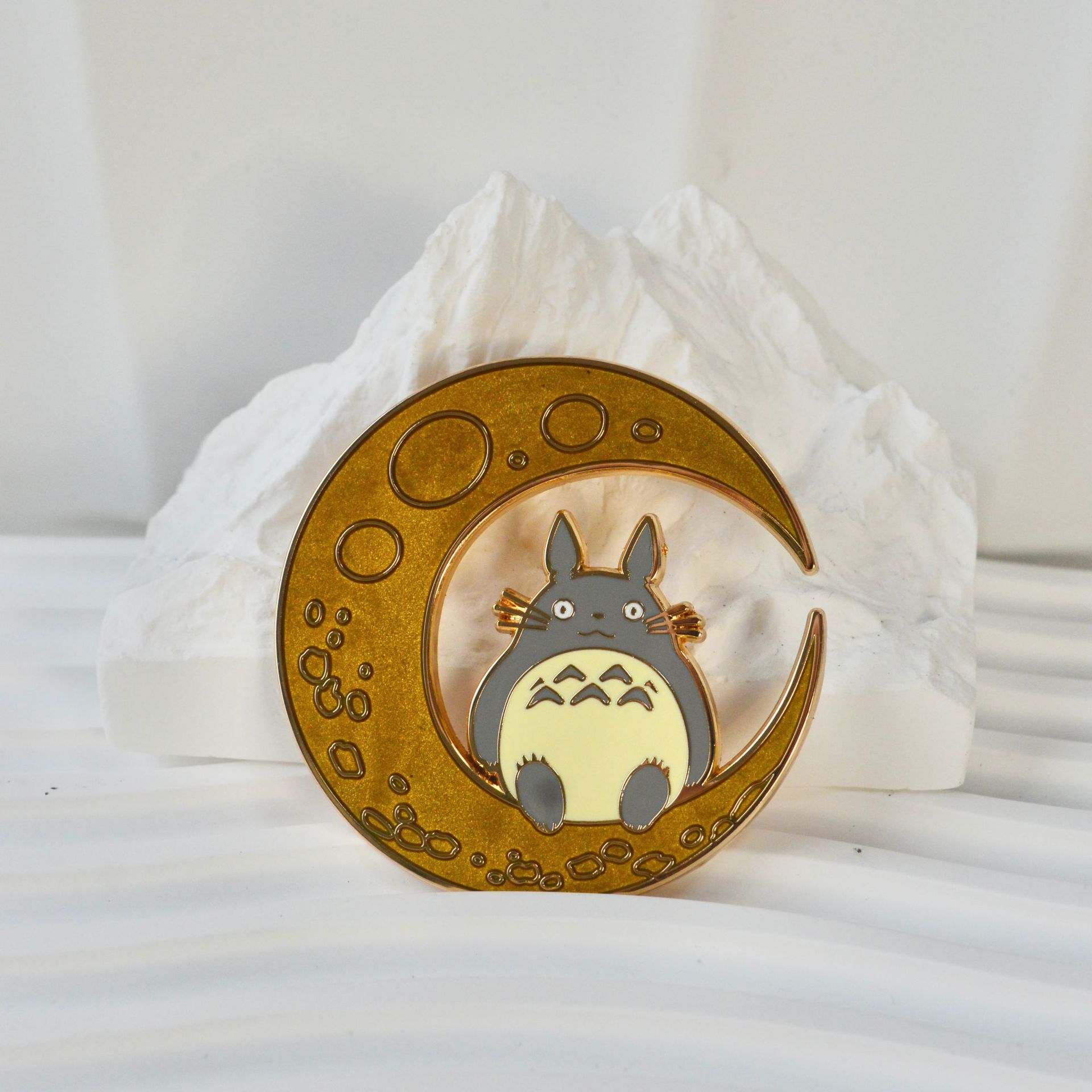Bring the charm of Studio Ghibli's iconic My Neighbor Totoro into your collection with this exquisite Totoro Lapel Pin. Featuring the beloved forest spirit in stunning detail, this 2-inch pin is crafted from high-quality zinc alloy and finished with a combination of vibrant hard enamel and soft, shimmering pearl enamel. The gold-plated edges add a refined, luxurious touch to the design, making it a perfect accessory for any anime lover.